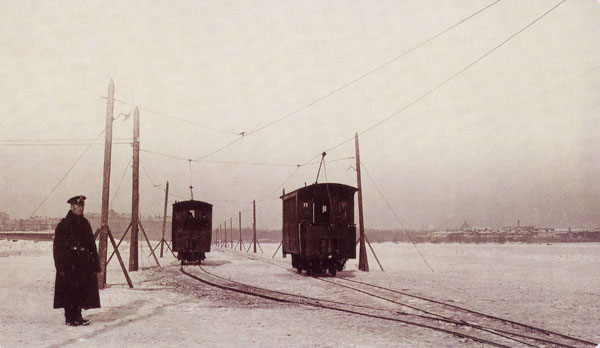 English: Trams ride on the ice of Newa river, Saint-Petersburg, end of 19th or just the beginning of 20tn century. Photo from the collection of Hermitage museum, by photographer Karl Bulla.)