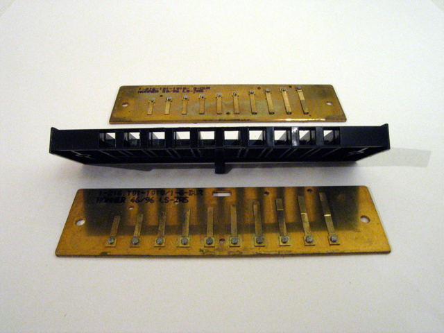 Partes constituintes de uma gaita: Pente e placas de palhetas.