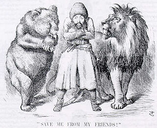 Deutsch: Das Große Spiel: der afghanische Emir Sher Ali mit seinen „Freunden“ Russland und Großbritannien. Text: “Save me from my friends.” (engl. „Beschütze mich vor meinen Freunden.“)