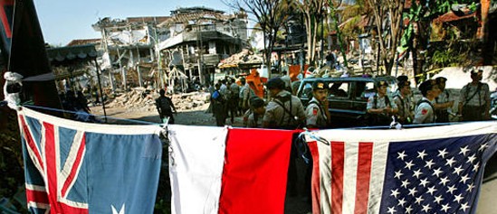 English: National flags at explosion site in Kuta, Bali, Indonesia