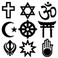 - 2nd Row: Islamic Star and crescent, Buddhist Wheel of Dharma, Shinto Torii