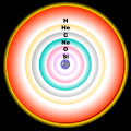 This diagram shows a simplified cross-section of a massive, evolved star (with a mass greater than eight times the Sun.) Where the pressure and temperature permit, concentric shells of Hydrogen (H), Helium (He), Carbon (C), Neon/Magnesium (Ne), Oxygen (O) and Silicon (Si) plasma are burning inside the star. (Not to scale.) The resulting fusion by-products rain down upon the next lower layer, building up the shell below. As a result of Silicon fusion, an inert core of Iron (Fe) plasma is steadily building up at the centre. Once this core reaches the Chandrasekhar mass, the iron can no longer sustain its own mass and it undergoes a collapse. This can result in a supernova explosion. |