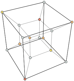 The 4D-hypercube, layered according to distance from one corner. As described in "Alice in Wonderland" by the grinning cat : ) this vertex-first-shadow of the tesseract forms a rhombic dodecahedron. The eight nibbles with an odd number of bits form a cube and are marked in silver. The two double bit pallindromes 0110 and 1001 (compare XOR and XNOR) are projected in the centre of the rhombic dodecahedron and are marked in gold. The other six nibbles with an even number of bits form an octahedron and are marked in bronze. |