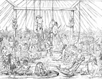 Painting by George Catlin of a Mandan okipa ceremony. Circa 1835.