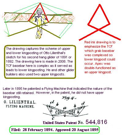 Mixed work. U.S. Government patent in public domain was combined with my own drawings and comment that are released to the public domain. The schematic drawing derives from the lines in photographs of Otto Lilienthal and of a sketch made of his triangular control frame that doubled in the TCF's apex as an upper kingpost. Later he went to two kinposts and sometimes no upper kingpost. His patent describes how the pilot would grab the "bar" in front of him