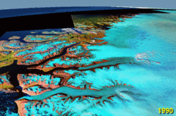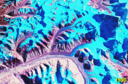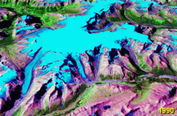 Left to right, the Mueller, Hooker and Tasman Glaciers in the New Zealand Alps, showing major retreat in the ~10 years circa 1990 to 2000. Notice the larger terminal lakes, the retreat of the white ice (ice free of moraine cover, high up on the glaciers), and (more subtly) the increase in height of the moraine walls due to ice thinning.
