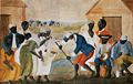 The Old Plantation (anonymous folk painting). Depicts African-American slaves dancing to banjo and percussion |