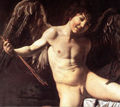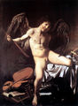 Amor Vincet Omnia by Caravaggio. Oil on canvas. Painted for marquess Vincenzo Giustiniani who veiled the work, revealing it only to selected viewers. Love, embodied by a wanton boy, triumphs over all human endeavors: war, science, music, government. Location: Staatliche Museen, Berlin