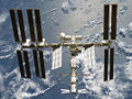 English: Backdropped by a blue and white part of Earth, the International Space Station is seen from Space Shuttle Discovery as the two spacecraft begin their relative separation. Earlier the STS-124 and Expedition 17 crews concluded almost nine days of cooperative work onboard the shuttle and station. Undocking of the two spacecraft occurred at 6:42 a.m. (CDT) on June 11, 2008.