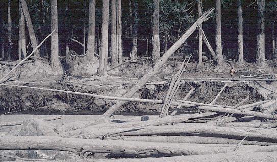 Mount St. Helens Mudline. Nearly 135 miles (220 kilometers) of river channels surrounding the volcano were affected by the lahars of May 18. A mudline left behind on trees shows depths reached by the mud. A scientist (middle right) gives scale. This view is along the Muddy River, southeast of Mount St. Helens. (October 23,1980, by Lyn Topinka, USGS/CVO) |