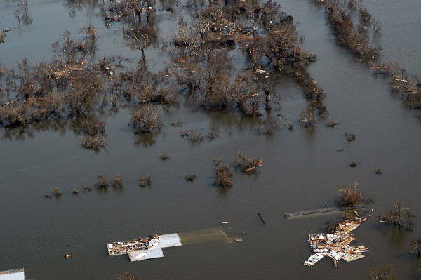 Flooding in Venice, Louisiana after Hurricane Katrina. Part of Venice, LA, on August 30, 2005. The southernmost permanently inhabited area on the Louisiana coast, Venice is located within a ring levee on the Mississippi River. The levee was ineffective during Hurricane Katrina. The entire town was flooded, oil-field vessels and barges were strewn haphazardly, and huge deposits of wrack were left on both sides of the ring levee on the west side of town. |