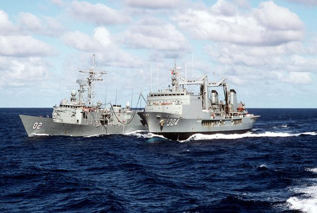 Details: ID: DNST9112040 Service Depicted: Other Service The Australian guided missile frigate HMAS CANBERRA (FFG-02) refuels from the Australian underway replenishment tanker HMAS SUCCESS (AOR-304) as the vessels takes part in exercise RimPac '88 off the coast of Hawaii. Camera Operator: PH1 TERRY COSGROVE Date Shot: 1 Jul 1988
