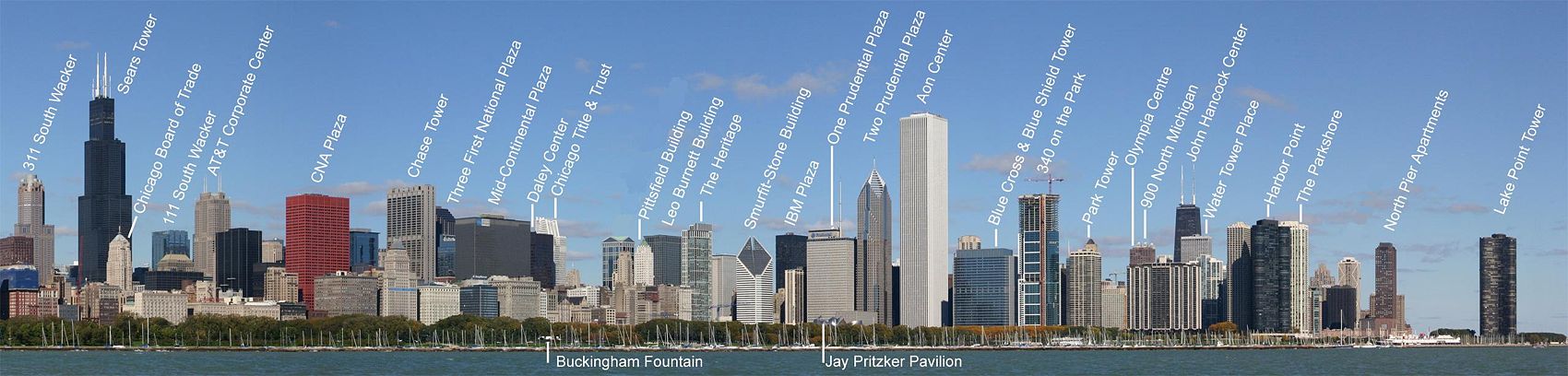 Chicago Skyline from Adler Planetarium Buphoff 18:46, 9 October 2006 (UTC). See en:Image:Chicago Skyline Crop Labeled 2560 ver2.jpg for building identification.