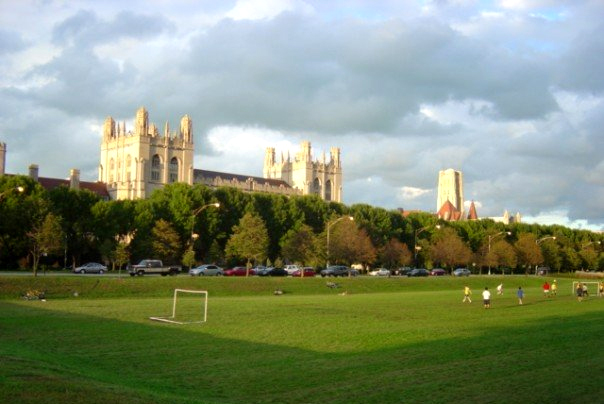 English: Several towers of the Main Quadrangle of the University of Chicago seen from the Midway Plaisance.