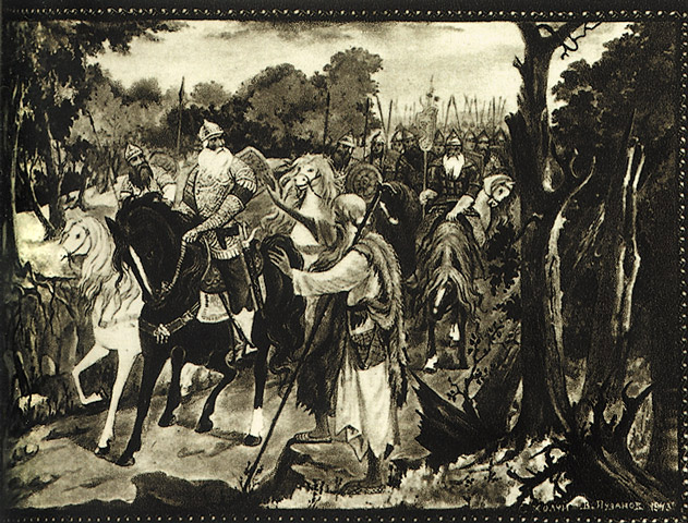 A traditional Kholuy miniature on the subject: Prince Oleg Approached by Pagan Priests (1943).