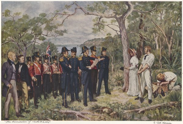 This is an image of The Foundation of Perth 1829, a 1929 painting by George Pitt Morison.