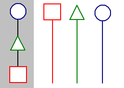 The square, triangle and circle represent three unrelated contemporary societies under study, one of hunter-gatherers, one of horticulturalists and one of agriculturalists respectively (a representation of the three-age system). In the unilineal evolution model at left, the three societies are analogized as a progression through set stages, while in the multilineal evolution model at right, their distinctive culture histories are emphasized.