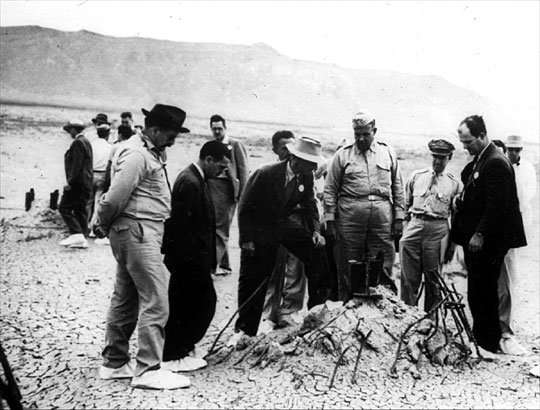 Rare government image of J. Robert Oppenheimer (in light colored hat with foot on tower rubble), General Leslie Groves (large man in military dress to Oppenheimer's left), and others at the ground zero site of the Trinity test after the bombing of Hiroshima and Nagasaki (some time after the actual test). It should be noted that most photographs of this event available are taken by wire press sources and are not public domain; this one however is in the public domain as a government photograph.