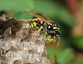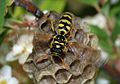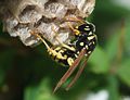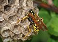 English: A young paper wasp queen ( Polistes dominula) is founding a new colony. The nest was made with wood fibers and saliva, and the eggs were laid and fertilized with sperm kept from last year. Now the wasp is feeding and taking care of her heirs. In some weeks, new females will emerge and the colony will expand. The timespan between the older and more recent photos is about one month