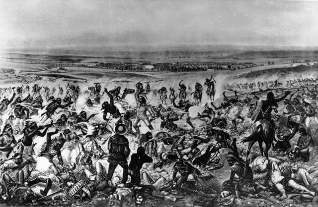 Originally from en.wikipedia; description page is (was) here * 20:42, 31 October 2005 [[:en:User:Lordkinbote|Lordkinbote]] 640×418 (49,591 bytes) <span class="comment">(Title: Custer's last stand Caption: Native American Lakota Sioux, Crow, Northern, and Cheyenne, defeat General Custer standing centre, wearing buckskin, with few of his soldiers of the Seventh Cavalry still standing, Little Bighorn Battlefield, June 26)</span> |