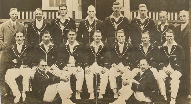 Image of 1930 Australian cricket team from the State Library of NSW, accessed at: http://image.sl.nsw.gov.au/cgi-bin/ebindshow.pl?doc=pxe653/a485;thumbs=1. Public Domain. Back: Kelly (manager), Jackson, Wall, a'Beckett, Hornibrook, Hurwood, Grimmett, Howard (treasurer) Centre: Fairfax, Ponsford, Richardson, Woodfull (captain), Kippax, Bradman, Walker. Front: McCabe, Oldfield |
