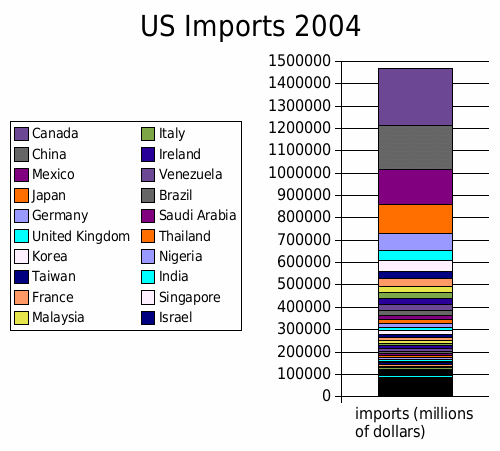 | current | 15:07, 1 August 2007 | 500×451 (19 KB) | Analoguni ( Talk | contribs) | (United States imports listed by the order of from which country the U.S. imports from the most. The top of the bar graph has the country that the US imports the most from, and it proceeds down the graph. Created with openoffice.org Calc. The data for this) |