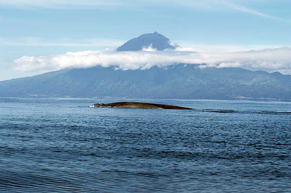 Blue Whale (Balaenoptera musculus) with the vulcano Pico Island, Azores, in the background