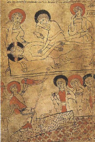 This page of a Hungarian manuscript from 1192-1195, discovered by Pray, shows the burial of Jesus. Notable are the L-shaped patches near the hands, suggesting a series of burn holes on the Shroud of Turin, and the unusual herringbone weave of the cloth in the lower panel, also suggesting the Shroud.