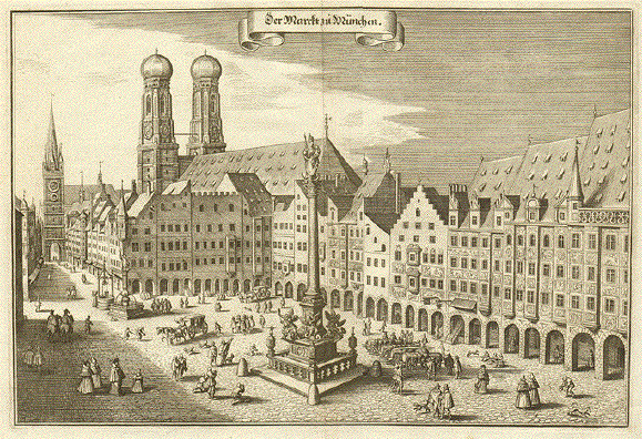- Description: Engraving by Matthäus Merian shows the Marketplace of Munich