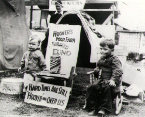 Children with sign "Hoover's Poor Farm"