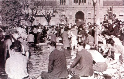 17 de octubre de 1945. Las patas en la fuente. Buenos Aires, Argentina. Fecha: 17 de octubre de 1945. Autor: desconocido. La foto es de dominio público según la Ley 11.723, Artículo 34 argentina y sus modificaciones que establece que todas las obras fotográficas pasan al dominio público luego de pasados 25 años desde su primera publicación. Foto tomada de http://www.geocities.com/jmheredia.geo/38j.htm, sin indicación de copyright