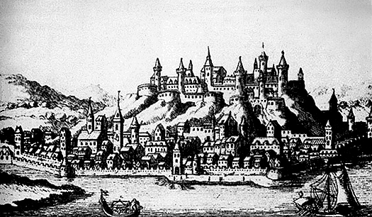 Fortress of Belgrade as it looked in the middle ages. Lower and upper town with the palace are visible.