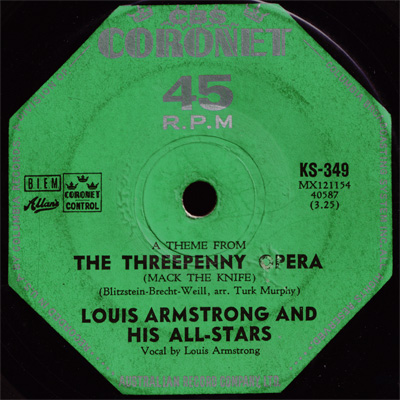 This is the record label for the 7" Single A Theme From The Threepenny Opera by the artist Louis Armstrong and his All-Stars.