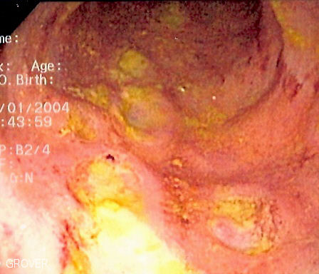 Endoscopic image of Crohn's colitis showing deep ulceration in sigmoid colon. Photo released into public domain on permission of patient. -- Samir धर्म 07:35, 2 June 2006 (UTC)