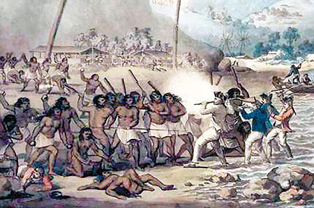 Copyright of the National Maritime Museum, London. "Death of Cook" by Cleveley original, discovered in a private British collection in 2004, depicting Captain James Cook as one of the participants in the battle between sailors and native Hawaiians.