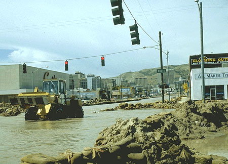 State Street in Salt Lake City, Utah, United States, being diverted into a river during flooding of City Creek Canyon in 1983.
