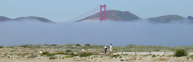Fog envelops the Golden Gate Bridge and and approaches Crissy Field