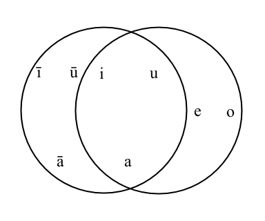 The circles contain the vowel phonemes of Standard Arabic (left) and Israeli Hebrew (right). Those are the distinctions that must be made for proper comprehension, the bare essentials of pronunciation. Of these, the long-vowel phonemes (ā, ī, ū) are unique to Arabic and the mid-vowel phonemes (e, o) are unique to Hebrew, while short a, i and u exist in both.