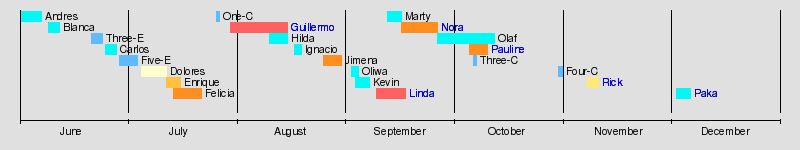 The season began with the formation of Tropical Depression One-E on June 1 and ended with the dissipation of Tropical Depression Paka on December 22. The season can alternatively be considered to end on December 6, the day Tropical Storm Paka crossed the international dateline. No named storms formed in May, three in June, four in July, four in August, five in September, one in October, and one in November. Very unusually, a tropical storm formed in December, after the season ended. The only other time this happened since the satellite era began was in 1983.