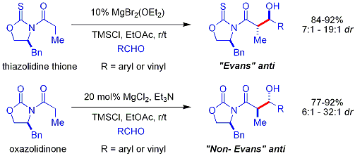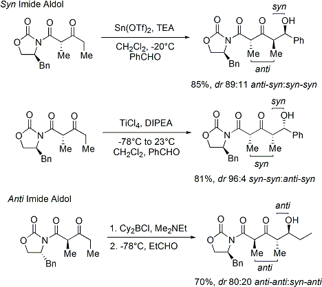 Upon construction of the imide, both syn and anti-selective aldol addition reactions may be performed, allowing the assemblage of three of the four possible stereoarrays: syn selective: and anti selective: