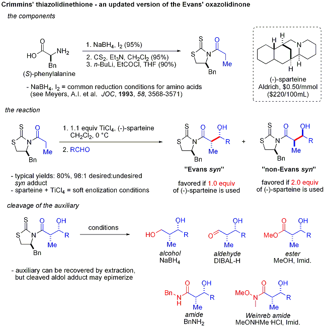 A more recent version of the Evans' auxiliary is the Crimmins thiazoldinethione. The yields, diastereoselectivities, and enantioselectivities of the reaction are generally high, although not as high as in comparable Evans cases. Unlike the Evans auxiliary, however, the thiazoldinethione can perform acetate aldol reactions (ref: Crimmins, Org. Lett. 2007, 9(1), 149–152.) and can produce the "Evans syn" or "non-Evans syn" adducts by simply varying the amount of (-)-sparteine. The reaction is believed to proceed via six-membered, titanium-bound transition states, analogous to the proposed transition states for the Evans auxiliary.
