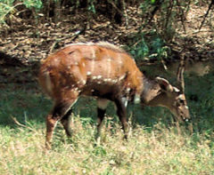 The Bushbuck (Tragelaphus scriptus) is an antelope that is found in forest and woodland throughout Sub-Saharan Africa. Also called "bush antelope", this is used occasionally for any relativers with which it shares its habitat.