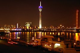 - Rheinturm (TV tower) the town's landmark (1982: 234 m/768 ft, since 2004: 240.50 m/789 ft), the lights on which comprise the world's largest digital clock.