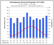 Across the Rhine Neuss was built on the delta of the Erft river. Düsseldorf lies southwest of the Ruhr mining district, and in the middle of the Rhine-Ruhr urbanized region. Düsseldorf is built entirely on alluvium, muds, sands, clays and occasionally gravels. The highest point in Düsseldorf is the top of Sandberg in the far eastern part of the city ( Hubbelrath borough) at 165 metres (541 ft). The lowest point is at the far northern end in Wittlaer borough where the Schwarzbach (Black Creek) enters the Rhine, with an average elevation of 28 metres (92 ft). Like the rest of the lower Rhinelands Düsseldorf has mild winters and moderately warm summers, with an average yearly temperature of 10.5 °C (51 °F) and 77 centimetres (30 in) of rainfall. The predominate wind direction is out of the south or southeast with velocities in the range of 3 to 4 m/s (7-9 mph), with gusts of 3.5 -4.8 m/s (8-10.7 mph). The wind is calm (under 2 m/s or 4.5 mph) about 35% of the time, more frequently at night and in the winter.