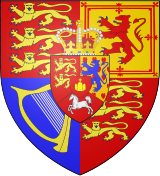 Whilst he was King of Great Britain, George's arms were: Quarterly, I Gules three lions passant guardant in pale Or (for England) impaling Or a lion rampant within a double-tressure flory-counter-flory Gules (for Scotland); II Azure three fleurs-de-lys Or (for France); III Azure a harp Or stringed Argent (for Ireland); IV tierced per pale and per chevron (for Hanover), I Gules two lions passant guardant Or (for Brunswick), II Or a semy of hearts Gules a lion rampant Azure (for Lüneburg), III Gules a horse courant Argent (for Westfalen), overall an escutcheon Gules charged with the crown of Charlemagne Or (for the dignity of Arch treasurer of the Holy Roman Empire).