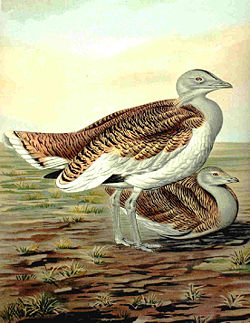 The Great Bustard, Otis tarda, is in the bustard family, the only member of the genus Otis. It breeds in southern and central Europe, where it is the largest species of bird, and across temperate Asia. European populations are mainly resident, but Asian birds move further south in winter.