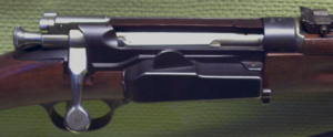 ![]() Closeup of the Krag-Jørgensen receiver and magazine door on a Norwegian M1912 Carbine |