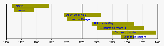 For information about specific French composers writing in late medieval era, see Jehan de Lescurel, Philippe de Vitry, Guillaume de Machaut, Borlet, Solage, and François Andrieu.