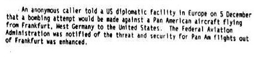 On December 5, 1988 the Federal Aviation Administration (FAA) issued a security bulletin saying that on that day a man with an Arabic accent had telephoned the U.S. Embassy in Helsinki, Finland, and had told them that a Pan Am flight from Frankfurt to the United States would be blown up within the next two weeks by someone associated with the Abu Nidal Organization. He said a Finnish woman would carry the bomb on board as an unwitting courier.
