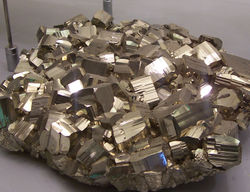 ![]() A mass of intergrown, striated pyrite crystals